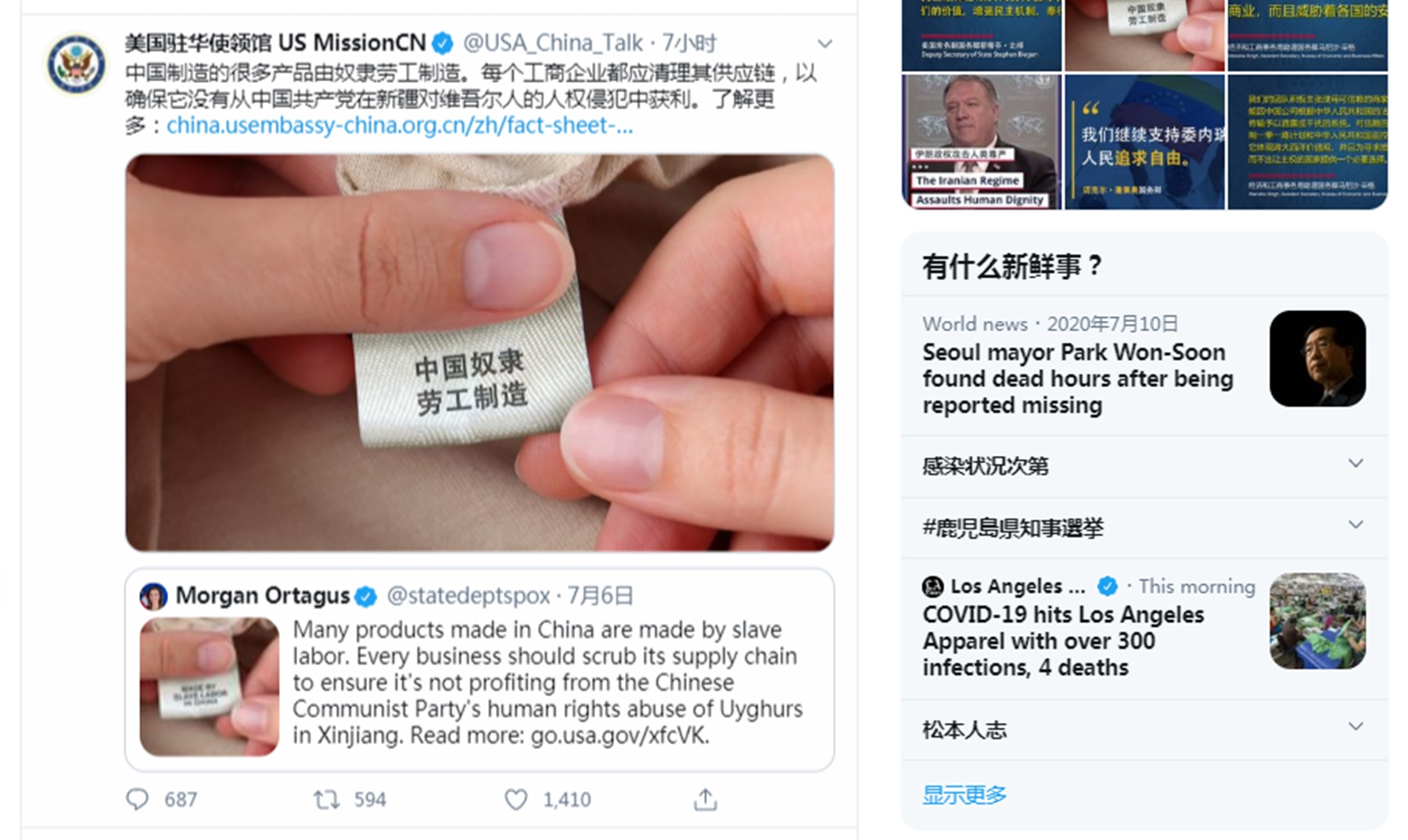 7月12日,美國駐華使領館的推特賬號(@USA_China_Talk)使用中文轉發和翻譯的一條推文稱,「中國製造的很多產品由奴隸勞工製造。每個工商企業都應清理其供應鏈,以確保它沒有從中國共產黨在新疆對維吾爾人的人權侵犯中獲利。」