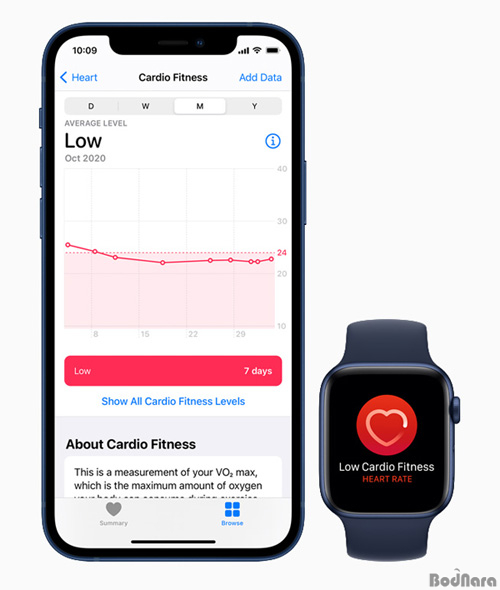 애플은 낮은 유산소 피트니스와 고연령대의 심장 질환, 고혈압 및 비만 등 심각한 건강 문제의 위험이 증가하는 것 사이에 높은 연관성이 있는 연구 결과를 언급하면서 유산소 피트니스가 흡연, 당뇨 및 고혈압 같은 일반적인 위험 요인보다 사망 위험을 더 강력하게 예측한다고 설명했다.